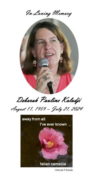 The published works of distinguished poet Deborah P Kolodji (August 11, 1959 - July 21, 2024) include Vital Signs (2024) published by Cuttlefish Books containing a collection of haiku about her fight with cancer, highway of sleeping towns (2016) published by Shabda Press containing an early collection of her haiku, Distance (2024) published by Shabda Press with her co-author Mariko Kitakubo concerning a collection of Tan-Ku dealing with the pandemic, and Eternal (2025) published posthumously by Shabda Press with her co-author Mariko Kitakubo concerning a collection of unpublished Tan-Ku dealing with the pandemic, mourning and the enduring connection between these two poets.